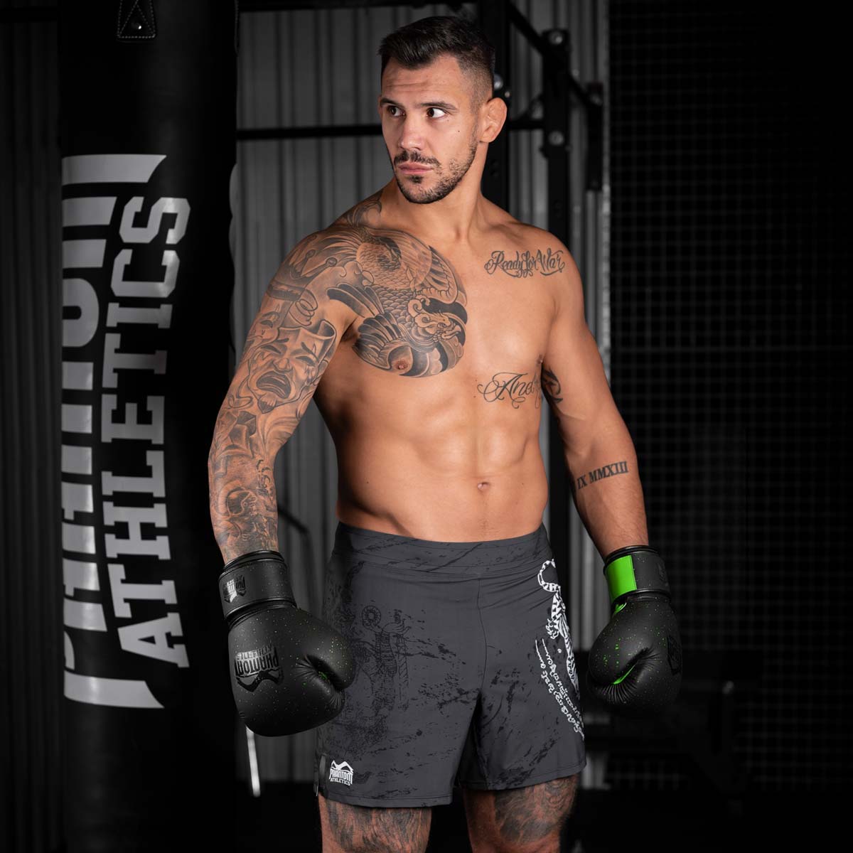Die Galaxy MMA Handschuhe überzeugen durch ein schwarzes Design mit Neongrünen Punkten.